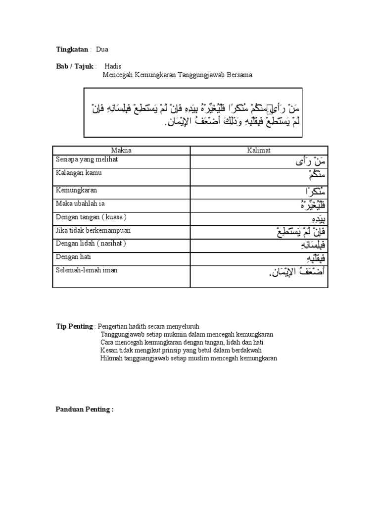 Makna Sesiapa yang melihat Kalangan kamu Kemungkaran Maka ubahlah ia Dengan tangan kuasa Jika tidak berkemampuan Dengan lidah nasihat Dengan hati Selemah-lemah iman Kalimat. FPP 2008 23. I هواسهبف عطتسي من نإف Sekiranya tidak mampu hendaklah dia mengubah dengan lidah.
